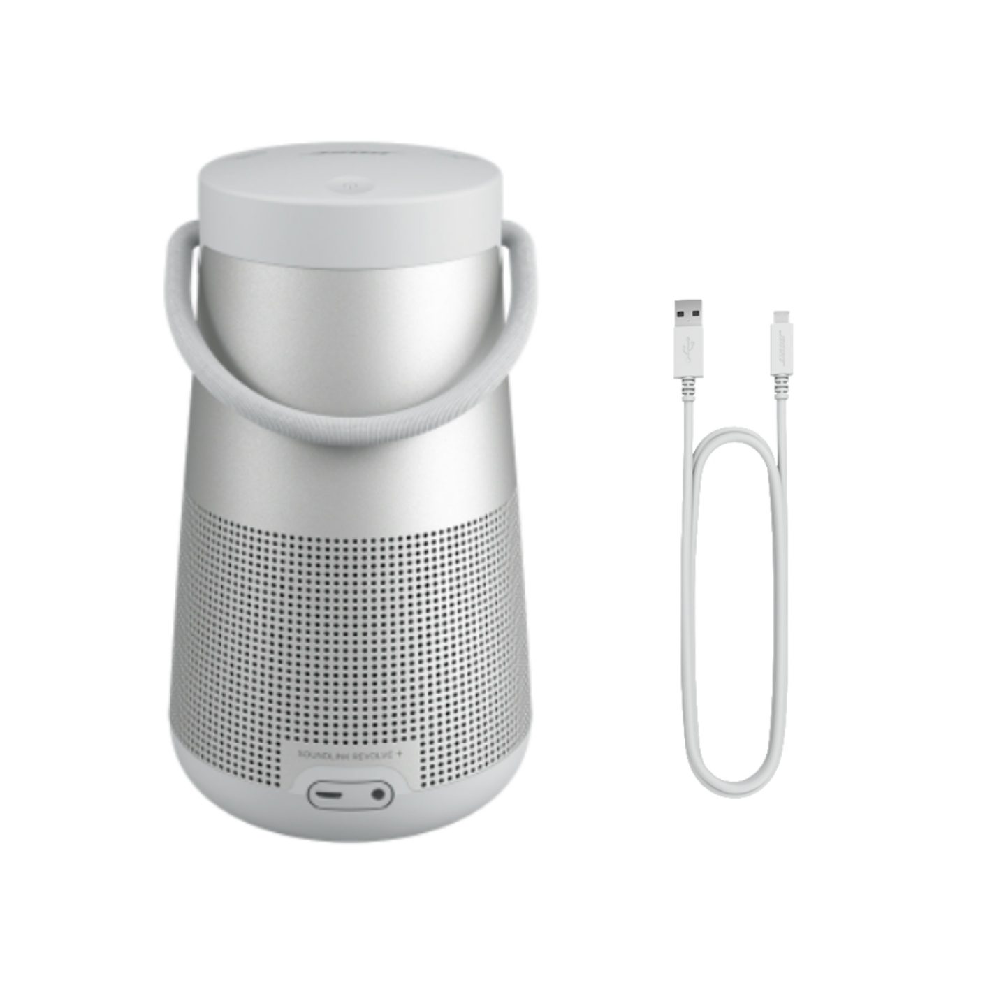 Wireless audio streaming and portability are combined in the Bose SoundLink Revolve+ Bluetooth Speaker. This speaker pairs with other Bluetooth-enabled devices, like smartphones and tablets, for wireless music streaming. An 1/8″ auxiliary audio input is also on-board for interfacing wired audio sources, such as MP3 players. The speaker is equipped with a built-in rechargeable lithium-ion battery that provides up to 16 hours of playtime. The SoundLink Revolve+ charges via its micro-USB interface.